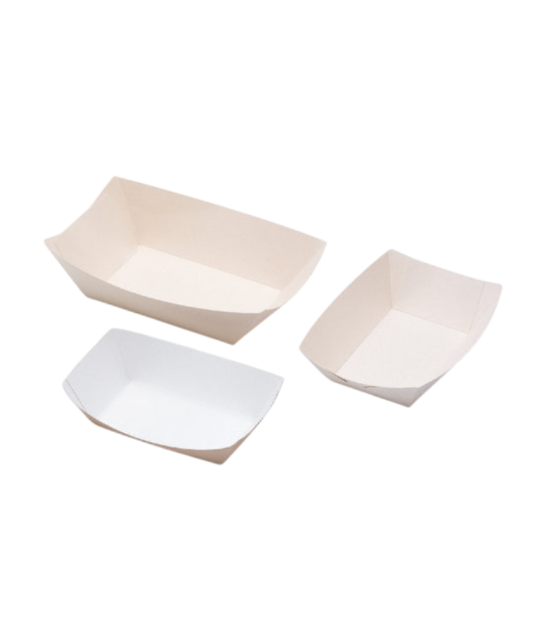 La bandeja tipo canoa de cartón blanca es una opción práctica, ecológica y versátil para servir alimentos de manera higiénica y atractiva.